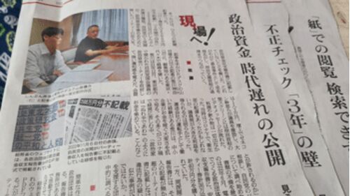 昨日開催された日本共産党地区役員講座で紹介された9月2日付けの朝日新聞。私も購読しているがまったく知らなかったので驚いた。記事は裏金事件の特集で「見えないカネ」と題して5回特集だった。1回目の冒頭で、「きっかけは、ひとつの新聞記事だった。……