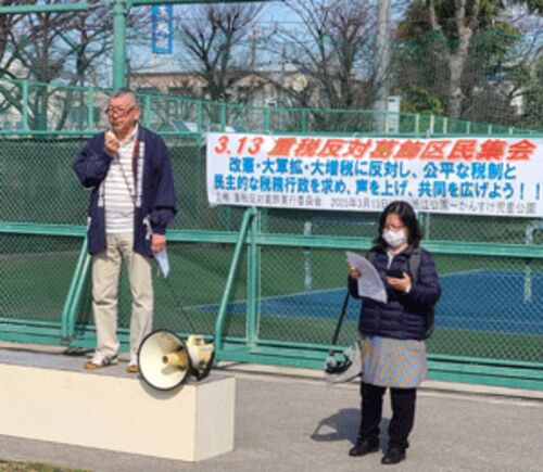 毎年実施されている重税反対区民集会が開催された。昨日とうって変わって暑い位の天気。葛飾民商の吉原会長のあいさつは、いつもユニークで、かつ練られている。今回は、軍事費を自分の背の高さに合わせて、教育費、中小企業費、社会保障費などがどのあたり…